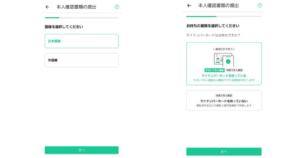 国籍の確認を行い、本人確認書類としてマイナンバーカードを選択します。
